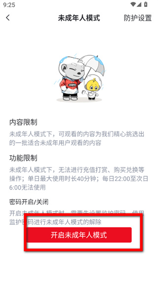 4、在未成年人模式界面,點擊開啟未成年人模式按鈕,即可開啟該模式。