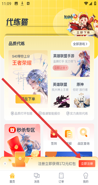 1、點(diǎn)擊“同意”,進(jìn)入代練貓APP首頁(yè)。