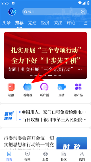 1、打開銀川發(fā)布APP首頁,點(diǎn)擊看電視功能入口,進(jìn)入電視頻道選擇頁面。