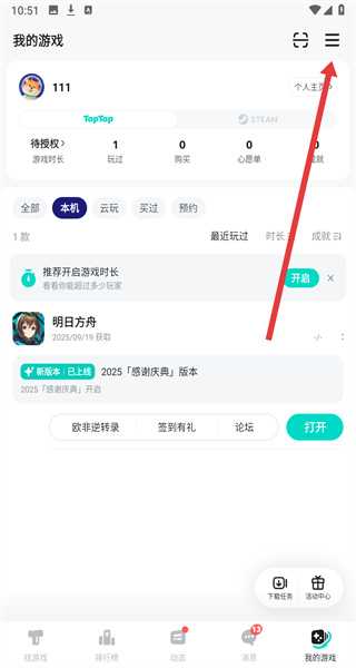 1、在TapTap“我的游戲”頁(yè)面點(diǎn)擊右上角三條橫線菜單按鈕。