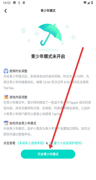 4、在青少年模式頁(yè)面點(diǎn)擊“開(kāi)啟青少年模式”,進(jìn)行開(kāi)啟。