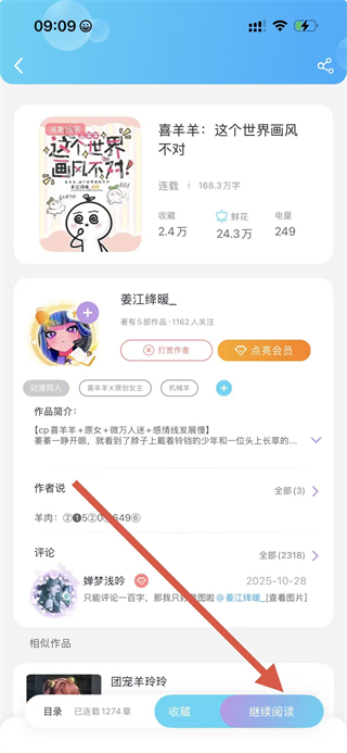 2、在小說詳情頁面,上滑屏幕點擊繼續(xù)閱讀選項,進(jìn)入閱讀界面。