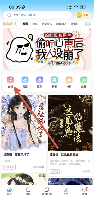1、在話本小說首頁,點擊女頻選項,進(jìn)入女頻書庫頁面。