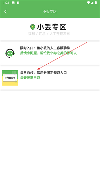 3、在小丟專區(qū)的頁面,點擊每日白領(lǐng)常用券固定領(lǐng)取入口。