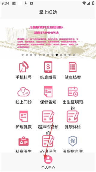 1、打開成都掌上婦幼app,在首頁(yè)點(diǎn)擊底部導(dǎo)航欄中的個(gè)人中心。