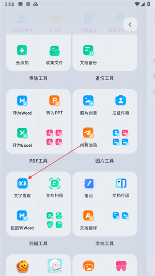 2、在彈出的菜單中,找到并點(diǎn)擊文字提取選項(xiàng)。