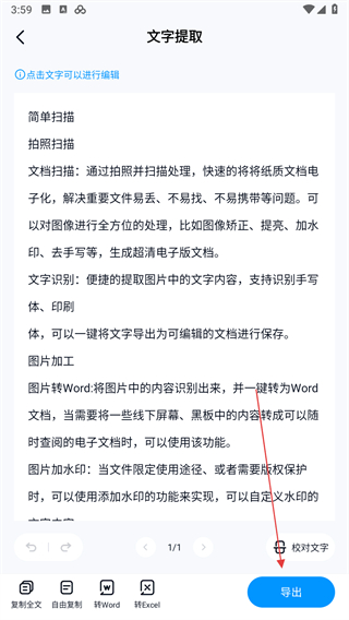 4、對提取的文字進(jìn)行編輯,點(diǎn)擊導(dǎo)出按鈕。