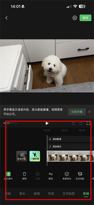 3、在剪輯界面中,可對視頻進行分割、刪除等畫面剪輯操作,還能添加濾鏡、特效、文字貼圖等。