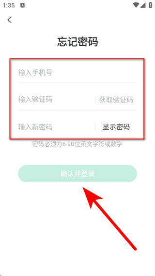 4、進(jìn)入頁面后,輸入手機(jī)號、驗(yàn)證碼和新密碼,點(diǎn)擊確認(rèn)并登錄,完成找回操作。