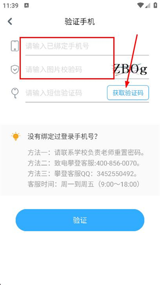2、在驗證手機頁面,填寫手機號和校驗碼,并點擊下方的獲取驗證碼。