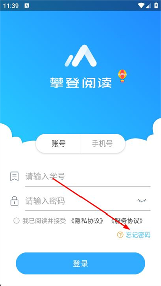 1、打開攀登閱讀app,在登錄頁面,找到并點擊右下方的忘記密碼選項。