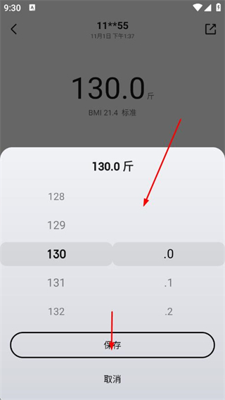 3、在彈出的體重設(shè)置頁面選擇體重數(shù)值后,點擊保存。