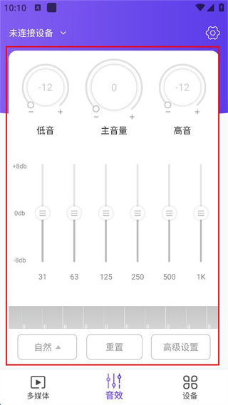 4、可在音效頁面選擇“自然”“重置”或進入“高級設置”進一步調整音效。