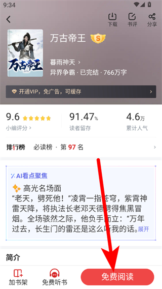 2、在書籍詳情頁面,點(diǎn)擊免費(fèi)閱讀按鈕,進(jìn)入書籍閱讀頁面。
