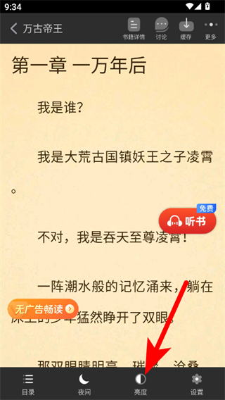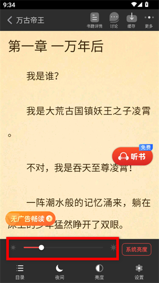 3、在書籍閱讀頁面,點(diǎn)擊亮度選項(xiàng),彈出亮度調(diào)節(jié)條。