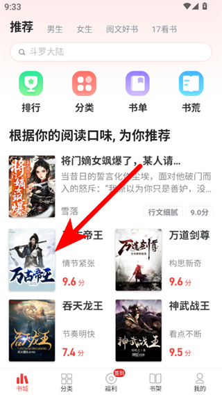 1、在追書神器書城頁面,點(diǎn)擊要閱讀的書籍,進(jìn)入書籍詳情頁面。