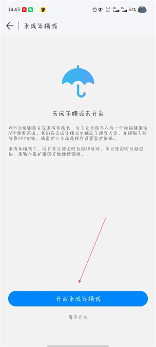3、在未成年模式頁面,點擊開啟未成年模式按鈕。