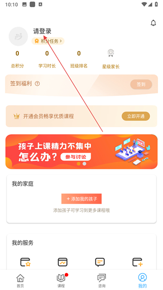 2、在我的頁面中,點擊家長昵稱下方的總積分區(qū)域,進入我的積分頁面。