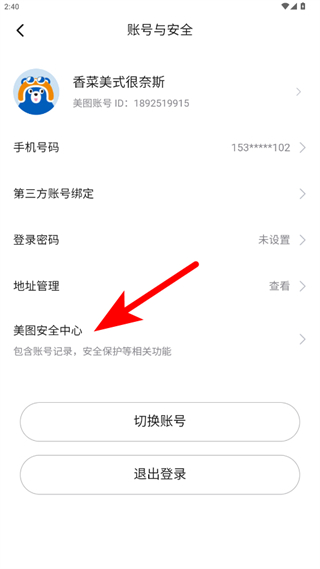 4、在賬號與安全頁面點(diǎn)擊美圖安全中心。