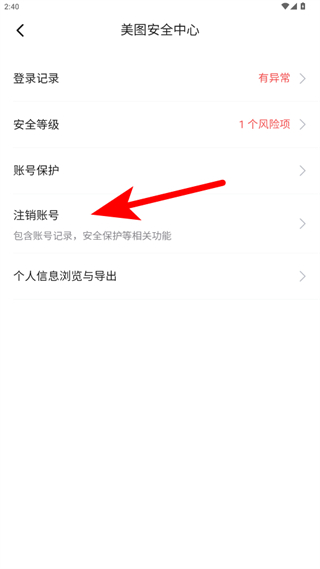 5、進(jìn)入美圖安全中心頁面后點(diǎn)擊注銷賬號,即可注銷美顏相機(jī)賬號。