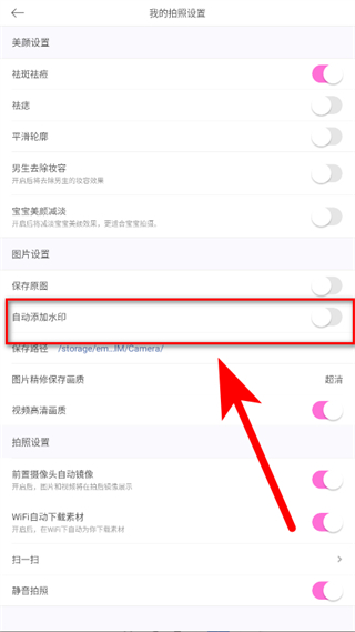 4、在我的拍照設(shè)置頁面找到自動添加水印選項,開啟該功能,即可在美顏相機(jī)中添加水印。