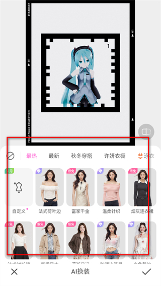 3、在AI換裝設(shè)置頁面選擇喜歡的服裝樣式,完成服裝更換。