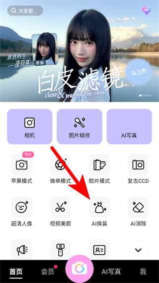 1、打開美顏相機(jī)APP,在首頁找到AI換裝選項并點(diǎn)擊,進(jìn)入圖片選擇頁面。