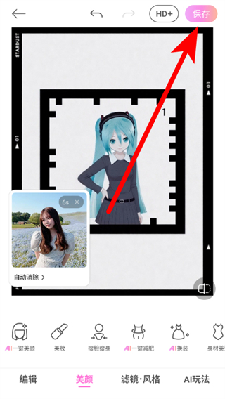 4、換裝完成后點(diǎn)擊保存,即可完成美顏相機(jī)的AI換裝操作。