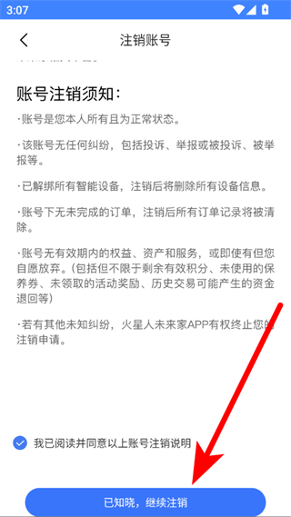 4、在賬號注銷須知頁面勾選點(diǎn)擊已知曉,繼續(xù)注銷,按照提示完成賬號注銷流程即可。
