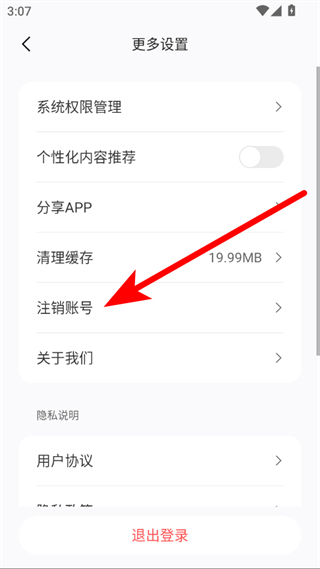 3、在更多設(shè)置頁面點(diǎn)擊注銷賬號,進(jìn)入賬號注銷須知頁面。
