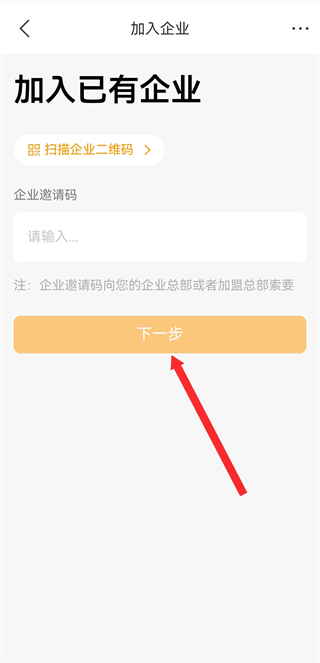4、在頁(yè)面可選擇掃描企業(yè)二維碼或邀請(qǐng)碼,輸入后點(diǎn)擊下一步,完成賬號(hào)注冊(cè)。