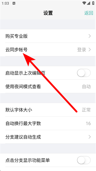 2、在設(shè)置頁面中,點擊云同步帳號的選項,進入云同步登錄頁面。
