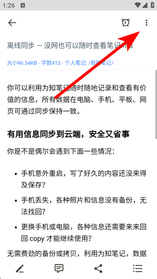 3、在文本筆記編輯頁面,點擊右上角三點菜單按鈕,彈出功能選項。