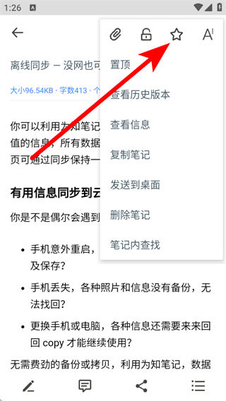 3、在功能菜單中,點擊星星形狀收藏圖標,即可完成筆記的收藏操作。