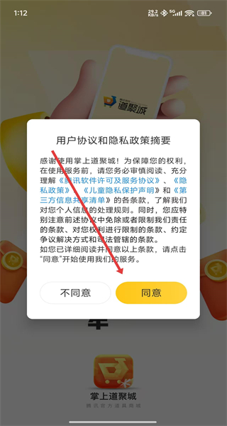1、點(diǎn)擊“用戶協(xié)議和隱私政策摘要”彈窗的“同意”,進(jìn)入掌上道聚城登錄頁面。