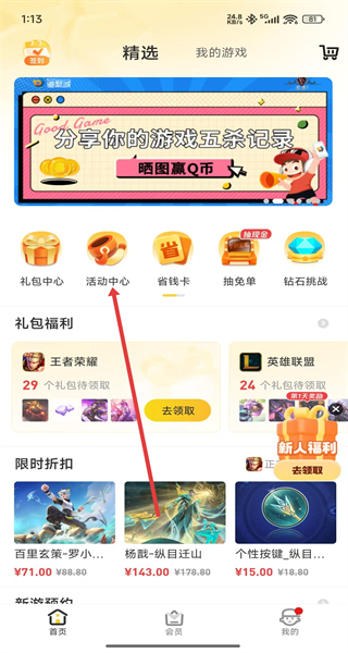 4、在進(jìn)入到應(yīng)用首頁后,可以點(diǎn)擊活動(dòng)中心按鈕,進(jìn)行查看活動(dòng)。