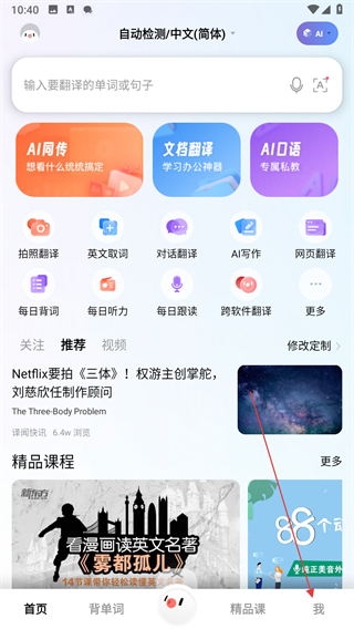 1、打開百度翻譯APP,點(diǎn)擊右下角我。