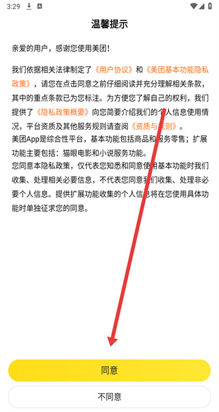 1、點擊“溫馨提示”的“同意”,進入美團主界面。