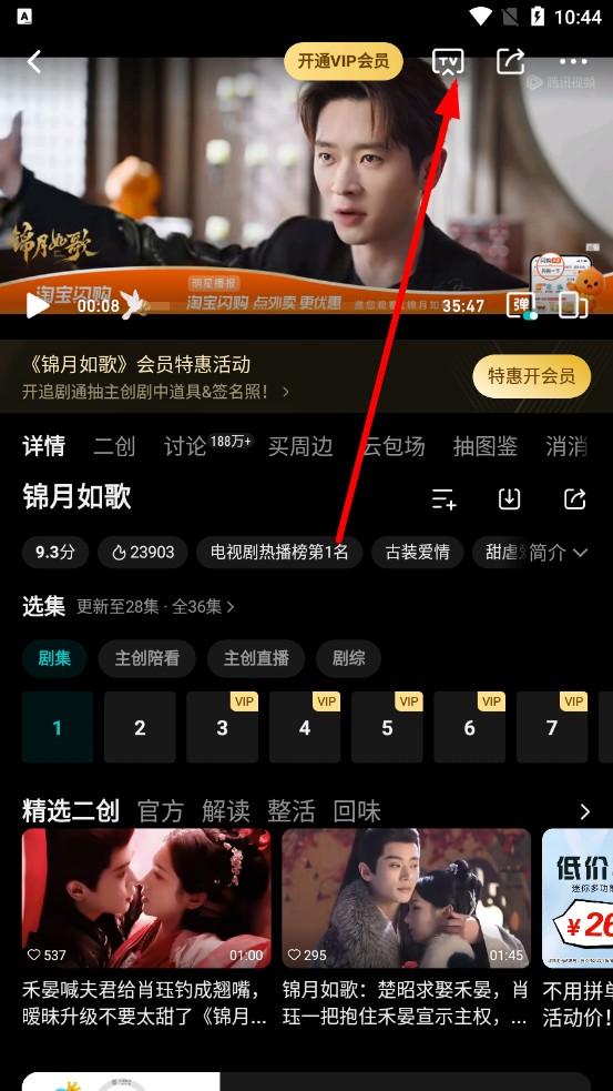 2、在播放詳情頁的右上角,找到形似電視圖標的投屏按鈕,點擊進入投屏搜索界面。