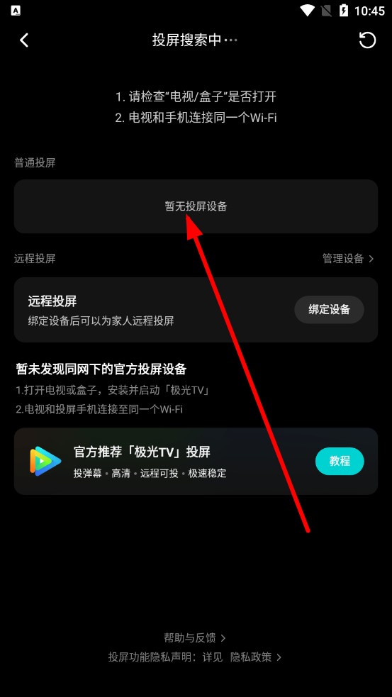 3、進入投屏搜索界面后,確保電視或者電視盒子已開啟,并與手機連接同一Wi-Fi網(wǎng)絡,等待系統(tǒng)自動搜索可用設備。