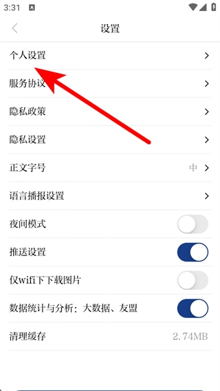 3、在設(shè)置的頁面,需要點擊個人設(shè)置的按鈕,進入個人資料頁面。