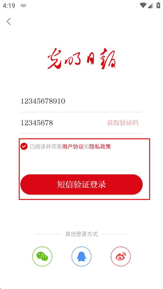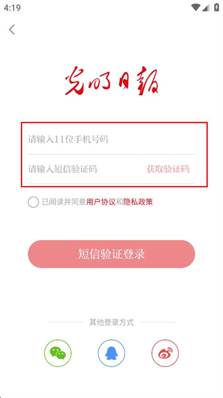 3、勾選已閱讀并同意用戶協(xié)議和隱私政策,點擊短信驗證登錄。