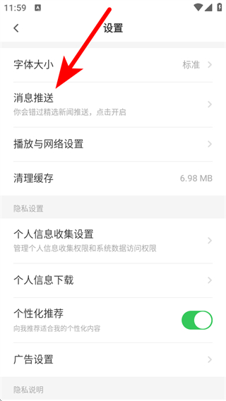 3、在設(shè)置頁面,點擊消息推送,進入開啟系統(tǒng)消息通知頁面。