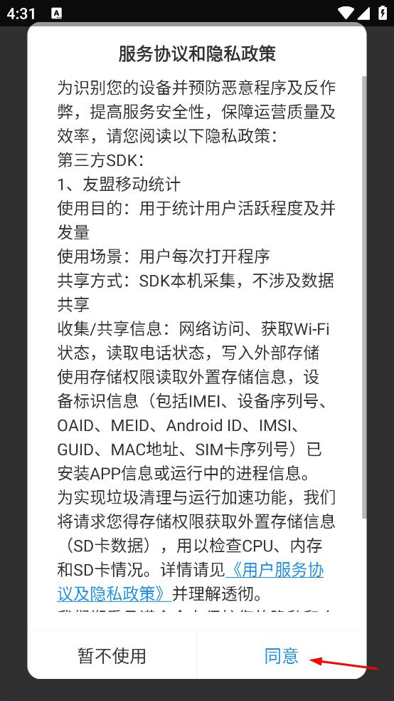 1、打開(kāi)該App,出現(xiàn)服務(wù)協(xié)議和隱私政策彈窗,閱讀后點(diǎn)擊同意按鈕。