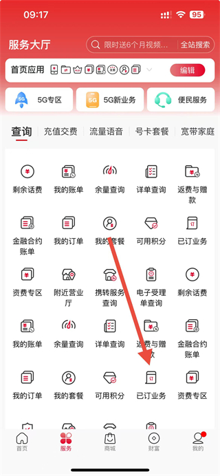 2、在服務(wù)大廳的查詢板塊中,點(diǎn)擊已訂業(yè)務(wù)選項(xiàng)。
