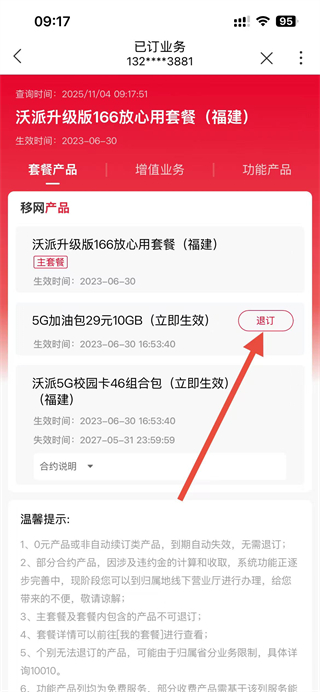 3、進(jìn)入已訂業(yè)務(wù)頁(yè)面后,找到要退訂的套餐,點(diǎn)擊退訂按鈕。