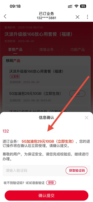 4、在信息確認(rèn)頁(yè)面,獲取并輸入驗(yàn)證碼后點(diǎn)擊確認(rèn)提交即可完成套餐退訂操作。