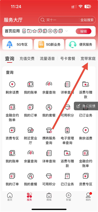 2、在服務大廳頁面,點擊寬帶家庭選項,進入寬帶家庭服務頁面。