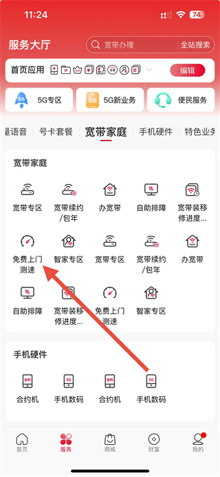 3、在寬帶家庭服務頁面,點擊免費上門測速選項,進入預約網(wǎng)絡(luò)檢測單頁面。