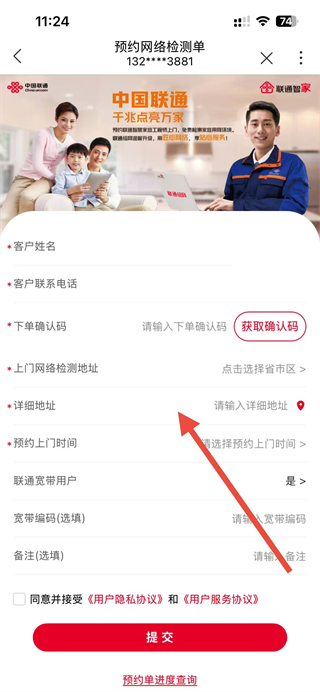 4、在預約網(wǎng)絡(luò)檢測單頁面填寫個人信息,勾選同意協(xié)議后點擊提交,即可完成免費上門測速服務預約。